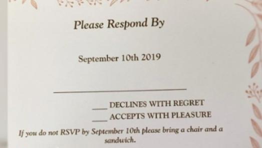 அதில், வருத்தத்தோடு நிராகரிக்கிறேன் அல்லது மகிழ்ச்சியோடு அழைப்பை ஏற்கிறேன் ஆகிய இரு வாய்ப்புக்களை தேர்வு செய்ய வழங்கியுள்ளனர். அதில் பின் குறிப்பாக செப்டம்பர் 10 ஆம் திகதிக்குள் வருகையை உறுதிப்படுத்தாதவர்கள், திருமணத்துக்கு வரும்போது தயவு செய்து ஒரு நாற்காலியையும், ஒரு சாண்ட்விச்சையும் எடுத்துக் கொண்டு வருமாறு கேட்டுக் கொள்ளப்பட்டுள்ளது.