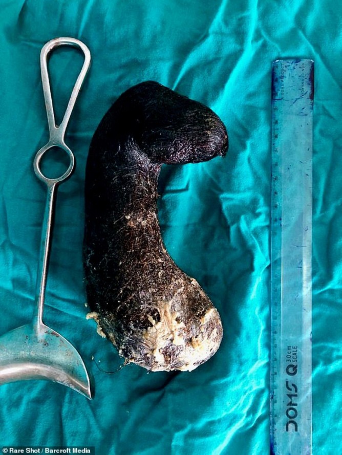 அவரது வயிற்றில் இருந்து சுமார் ஒன்றரை கிலோ கிராம் அளவுக்கு தலை முடி உருளையை மருத்துவர்கள் அகற்றியுள்ளனர்.